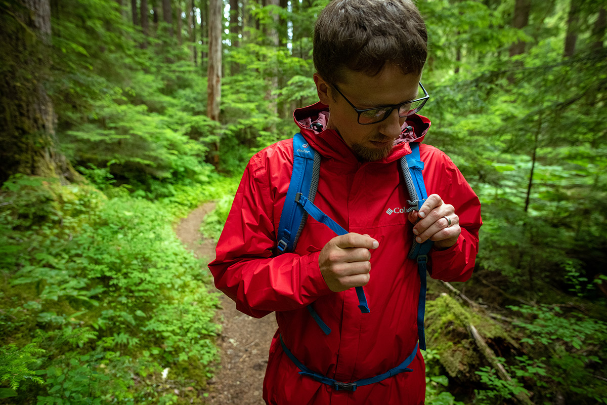 在儲物方面,哥倫比亞為防水二代雨衣配備了兩個簡單的帶網眼襯里的插手口袋,這應該能滿足大多數用戶的需求。口袋足夠大,可以存放手機和鑰匙等必需品,而且還配有小的防風片,有助于防止濕氣進入。值得注意的是,當穿著背包時,這些口袋的位置有點低,不太容易夠到,不過解開背包的腰帶就能解決這個問題。這款雨衣沒有胸前口袋和內袋,但對于日常使用來說,這應該不是太大的問題。