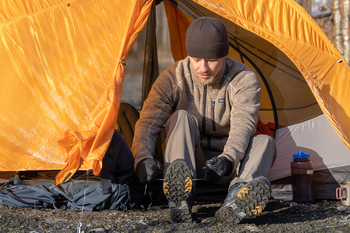 短靴類似于拖鞋,但有較高的鞋領。在寒冷天氣的冒險中,需要更多覆蓋時,短靴是工作人員的最愛。我們的清單中包括兩款短靴:Feathered Friends 羽絨短靴和 Outdoor Research 苔原履帶短靴,這兩款都超過腳踝高度,且在鞋口處有抽繩設計,可阻擋風和濕氣(Feathered Friends 的鞋子在腳踝處還有一條額外的抽繩)。我們清單上的許多拖鞋也有短靴版本出售,包括 TNF 牽引拖鞋、Teva ReEmber 和 Exped 露營拖鞋。與拖鞋相比,短靴由于高度增加和材料更多,穿脫更困難,通常需要雙手才能穿上,最大的優點是在寒冷環境中提供更多的溫暖和覆蓋。我們通常在冬季以外的月份不穿短靴,但對于小屋旅行、滑雪后活動和冬季露營來說,它們可能是一個不錯的選擇——只是不要期望它們能取代一雙冬季靴子。