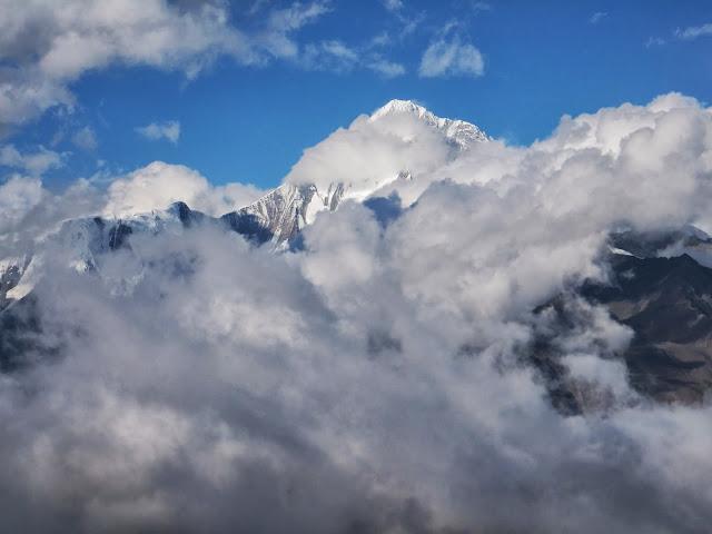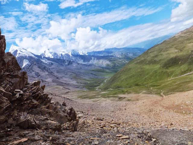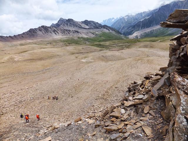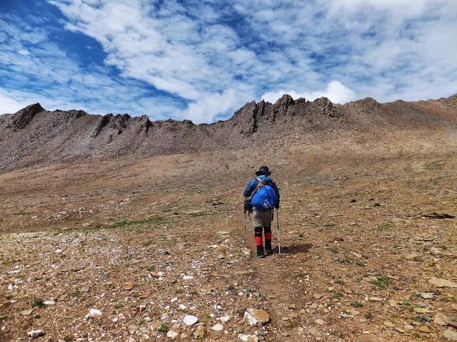 續(xù)行不久就要翻越埡口了,這是一段較長的上坡,上日烏且埡口的路佈滿松動的碎石,須小心翼翼,日烏且埡口海拔4900M,是這次貢嘎穿越的最高海拔,日烏且埡口是日烏且溝和莫溪溝的分水嶺,埡口氣象萬千,可以看到貢嘎中部和南部的群山。