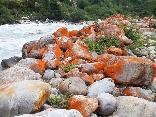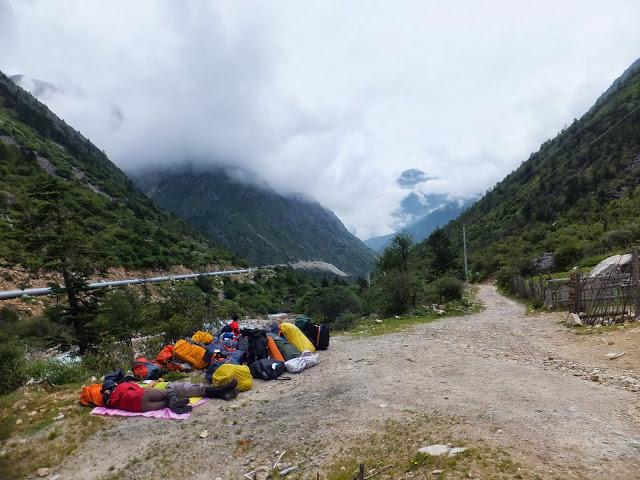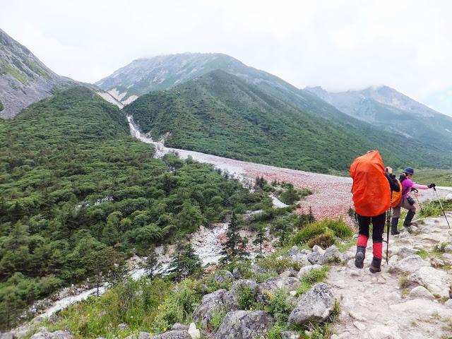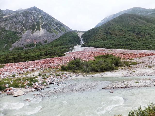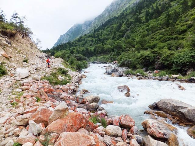 9:15分批搭車到水電站后登山口,9:40第一批抵達,但一直等到將近12:00才把所有背包、人等載至登山口。我因是第一批到登山口,所以有充分的時間觀賞附近景致,一旁花草爭艷,河床旁佈滿紅色石頭,河谷中的石頭都難得的長著一種罕見的鮮紅色苔蘚,說明了這兒自然環(huán)境未被破壞,沒有任何污染。12:00開始了我們的貢嘎徒步穿越之旅!