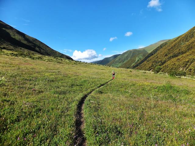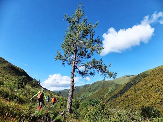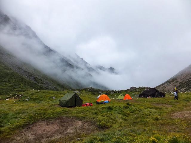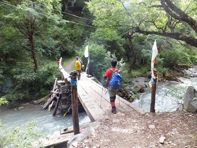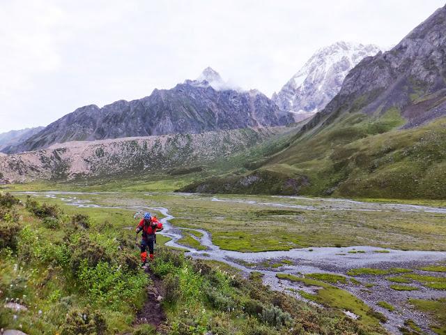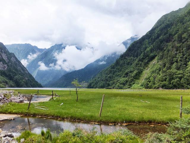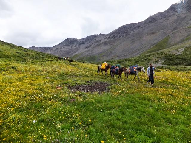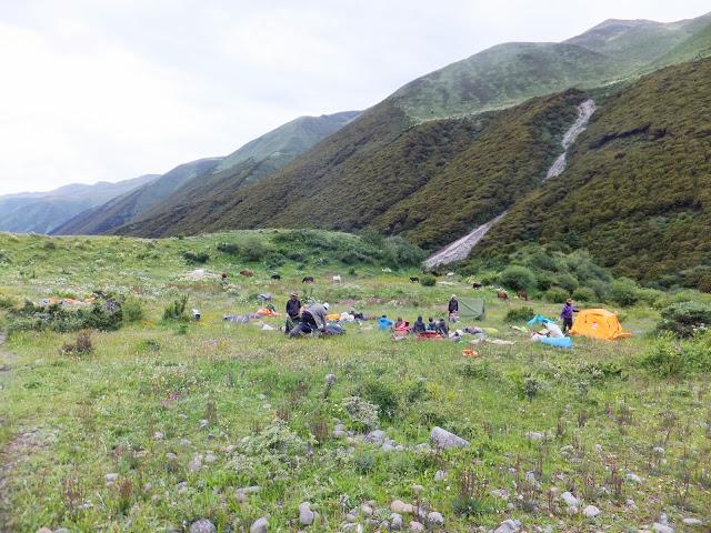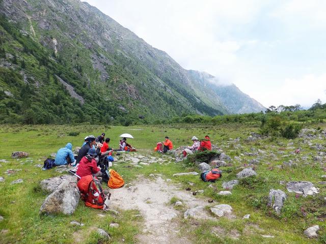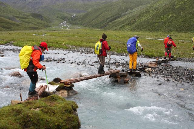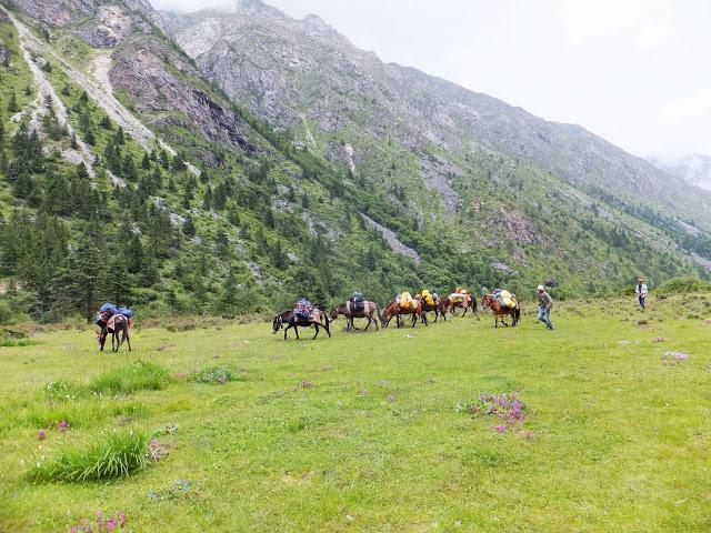 11:10終于登上埡口,這是徒步到過最高的地方,在此小休后,翻過埡口,豁然開朗,一路下坡,路也好走了許多,一路上高山流水,野花盛開,15:40終抵莫溪溝,聽說過河后還要走2小時才到營地,可我走到此已是累虛虛了,還要再走2小時,當下就不敢再休息了,16:00再度動身,,17:30第一個抵達營地,原來向?qū)潞竺娴娜藷o法抵達冬季牧場,因此于半途扎營,最艱難的路已經(jīng)走完,高山反應(yīng)也適應(yīng)得差不多了,接下來幾天的路大抵應(yīng)該較輕松了。