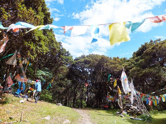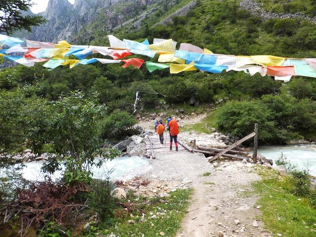 8:00從營地出發(fā),11:00經(jīng)過冬季牧場后,于溪邊午餐,之后續(xù)行,12:40下起雨來,趕緊穿上雨衣,雨褲就不穿了,因之前過溪不小心跌坐溪上,褲子全濕了。15:30終于來到了貢嘎寺和上子梅村的岔路口,到處飄動著的經(jīng)幡,隨時都能感覺到藏傳佛教的訊息,彩色的風馬旗在大地與蒼穹之間飄蕩搖曳著。在此拍照、休息后,陡下往上子梅村,16:50過橋后開始上坡,17:10抵三叉路口(產(chǎn)道),往左通往巴望海,往右通往上子梅村;路旁有一藏族賣著啤酒,大伙暢飲一杯,17:40抵上子梅村。于貢嘎寺和上子梅村的岔路口往下時,遠遠看見山下3座房子,就是上子梅村,全村一共就三戶人家,猶如人間仙境、世外桃源,藏民家都掛上了家庭旅館的牌子。