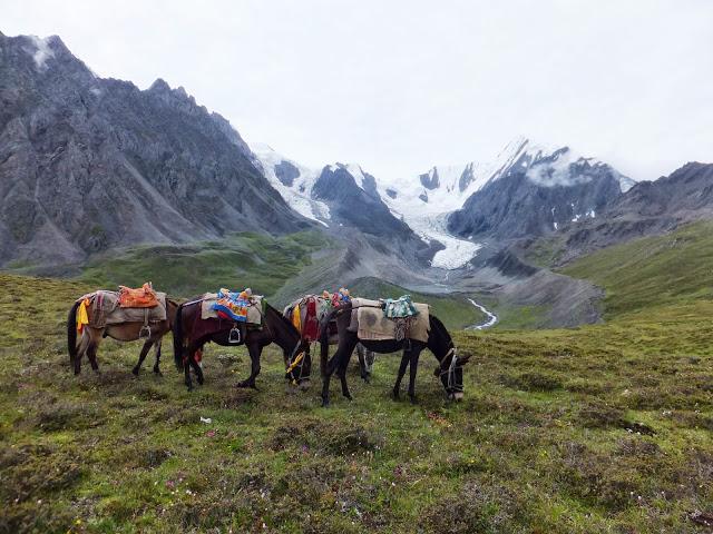 今天須翻越日烏且埡口,是非常辛苦的一段行程,爬升700M,再下降1000M。7:00離開營地,慢慢爬升,8:50眼前幾座雪山,有冰川和海子,真是太壯觀了,最高的雪山就是日烏且峰6376M,雪山下的冰川清晰可見;大伙在此盡情拍照,還碰上大陸一隊年輕人騎著馬經(jīng)過,害我們好生羨慕。