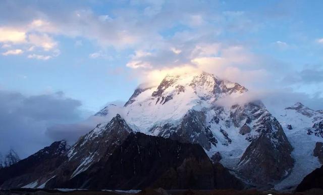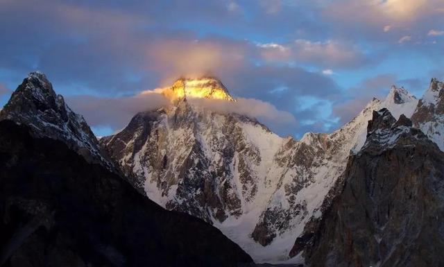 夕陽西下,K2隱沒在濃云之中。陽光照耀在布洛阿特峰頂,頂峰似乎在熊熊燃燒。