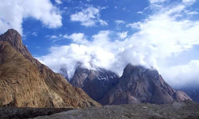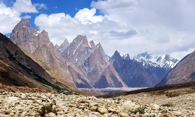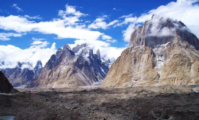 藍天白云下,遠處的uli biaho峰群、中間的川口峰群、近處的教堂峰,依次排開,山腳下是滾滾的baltoro冰川。