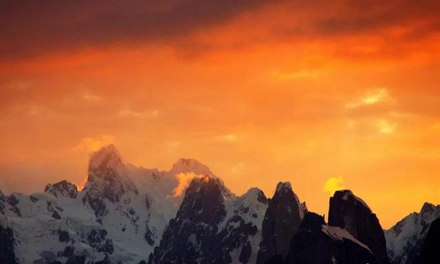 緋紅的晚霞,照亮了遠處天邊的uli biaho峰群和川口峰群,山巔金色輕煙彌漫。