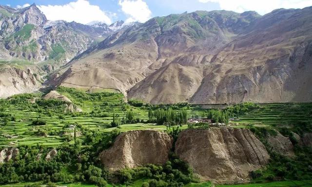 順著河谷繼續往北,一路田園風光。這里的村莊分布很有特點,山頂上有冰川,沿著山谷融水成小河,下面蘊育出綠洲,村莊也就自然而然出來了。這里冰川數量之多,讓人驚嘆。河谷邊的山峰,高度不過5千多米,山頂上卻是冰川密布。