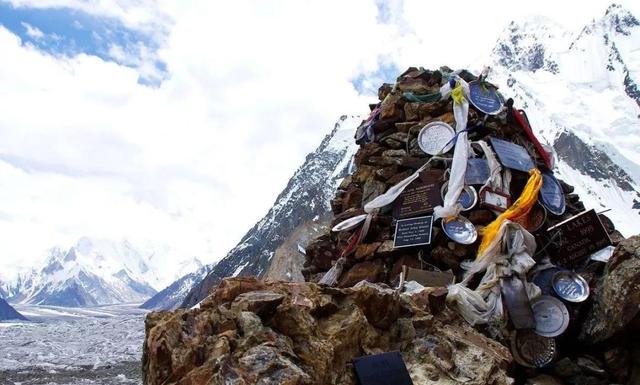 先來到大本營西側的一座山崖,半山腰有座用石頭壘起來的紀念塔,上面掛滿了在K2遇難的登山者的紀念牌。