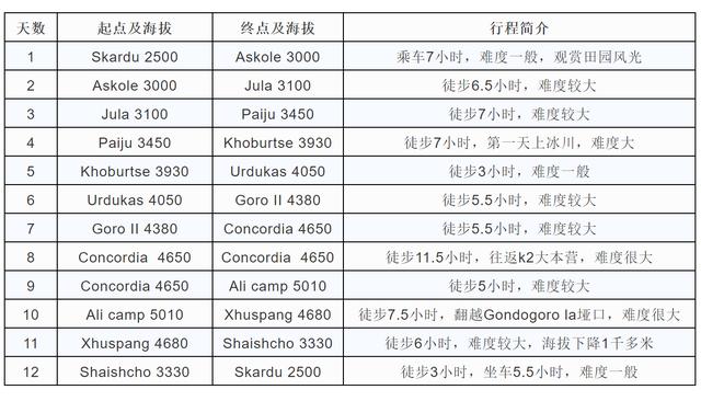 1、以上行程為參考行程,考慮到從Concordia一天時間往返k2大本營,難度很大,建議分為兩天,在k2大本營住宿一晚,這樣總行程增加1天;