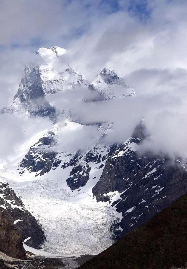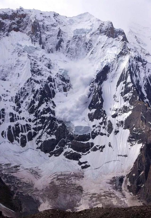 旁邊的雪山發生了巨大雪崩。滾滾積雪直落上千米,氣勢驚人。