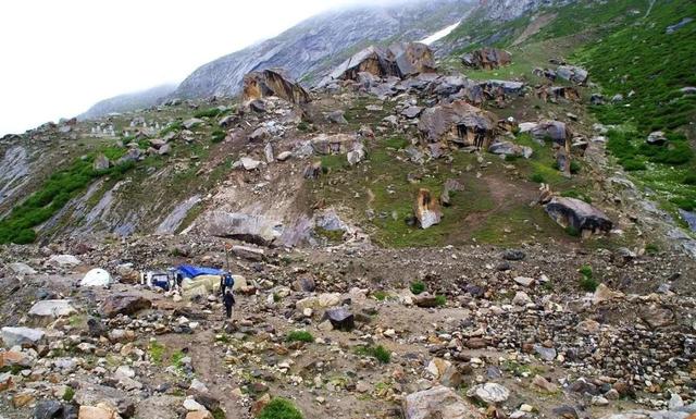 urdukas營地建在冰川邊的小山坡上,這里遍布巨大的巖石,帳篷就搭建在巨石下面。