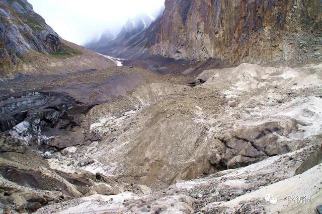 再往前走,就來到了baltoro冰川的最前端,冰川厚度幾十米。這就是河流的源頭,原本以為很多涓涓細流匯聚成河,到了近處才發現不是,整條河流從冰川的缺口處奔涌而出,沒想到冰川底下居然潛伏了這么大一條河流。