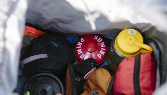 背包的最底部先放地席、睡袋、保暖衣物等較輕身及不急于使用的物品,然后再擺放營(yíng)幕、天幕等等。另外營(yíng)幕連同營(yíng)釘、營(yíng)柱等等重新折疊,進(jìn)一步節(jié)省空間。