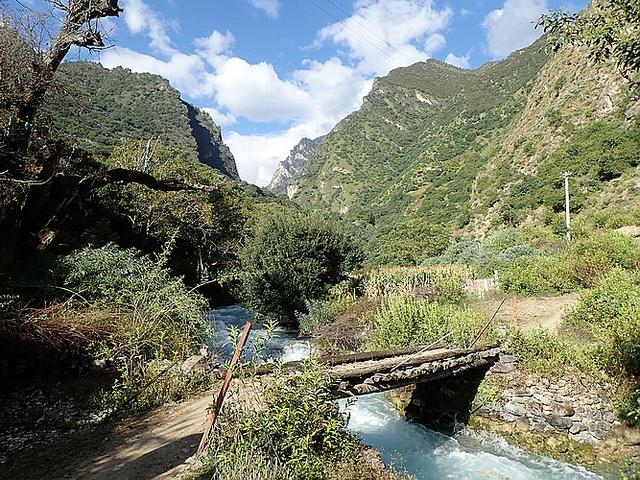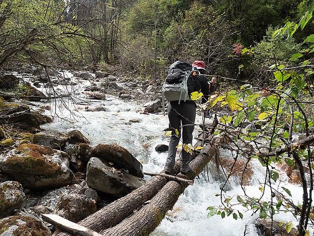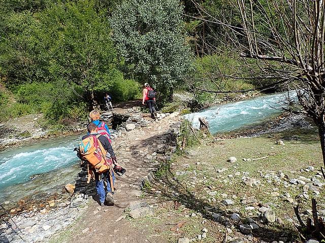 第一天的行程都是沿著白水河岸往上走,雖然白水河只是個小支流,水流量卻多得驚人。因為七八九月這區域是雨季,十月初才慢慢進入秋天的干季,一開始的路徑還蠻清楚的,沿著河左岸不斷的爬升,路并不陡,因為連馬都可以走的,一路上要渡橋好幾次。