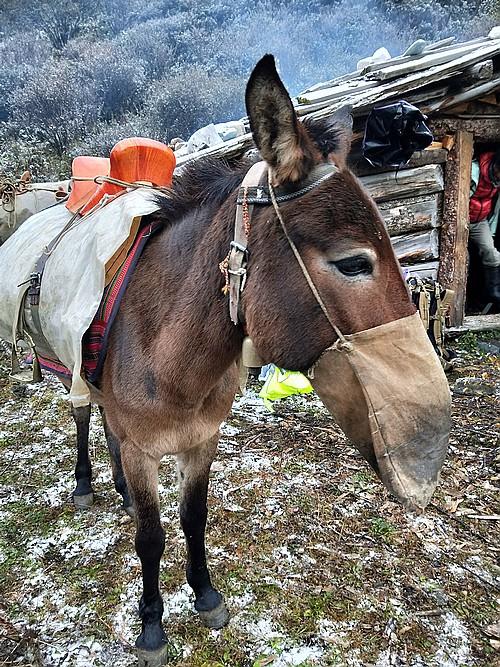 一早馬兒吃早餐。我們的馬兒其實是騾子,也就是馬跟驢子的小孩,馬幫趕的其實都是騾子。因為驢子溫馴,馬兒負重能力強,騾子就有兩方的優點。