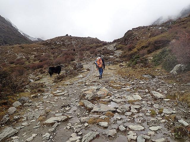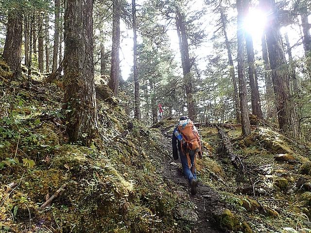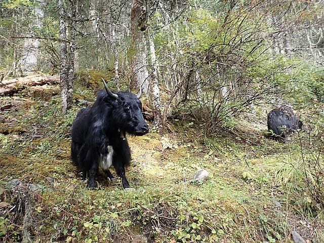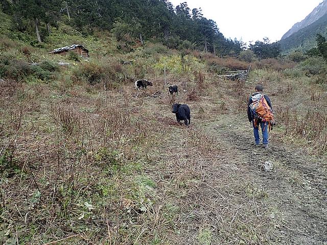 從小河旁小屋走沒多久,途經前一日的落難無屋頂牛棚之后,開始進入森林,緩上坡,后來路上又遇見好幾只就擋在路中央的牦牛。