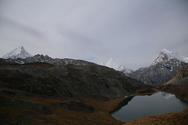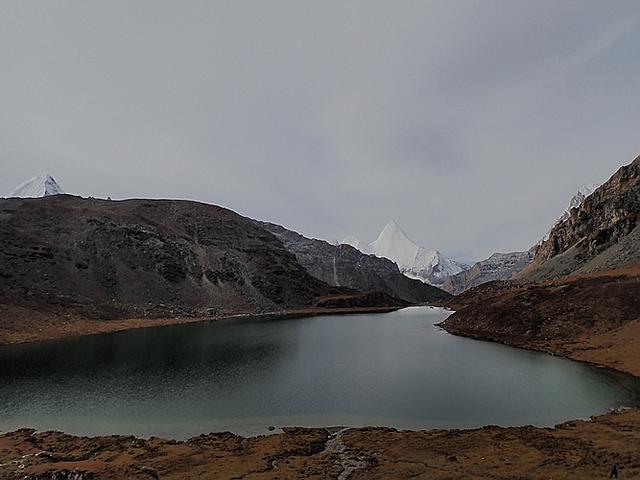 從湖的另外一邊可以直接看到三怙主三神山,由左到右就是夏諾多吉、央邁勇、仙乃日。
