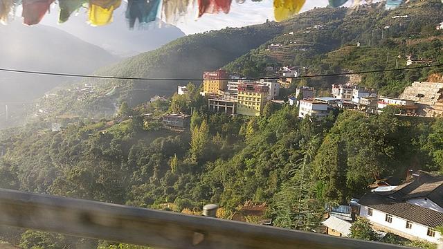 我們經過沖古寺(左邊遠處),但是今天背包太大,我們打算明天再來逛亞丁