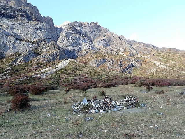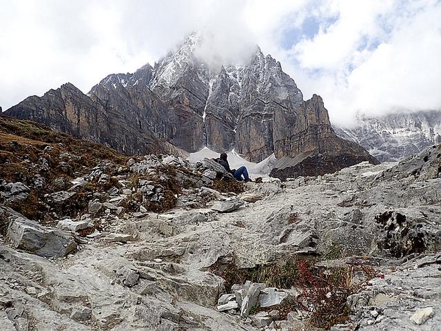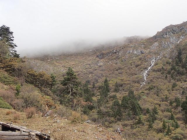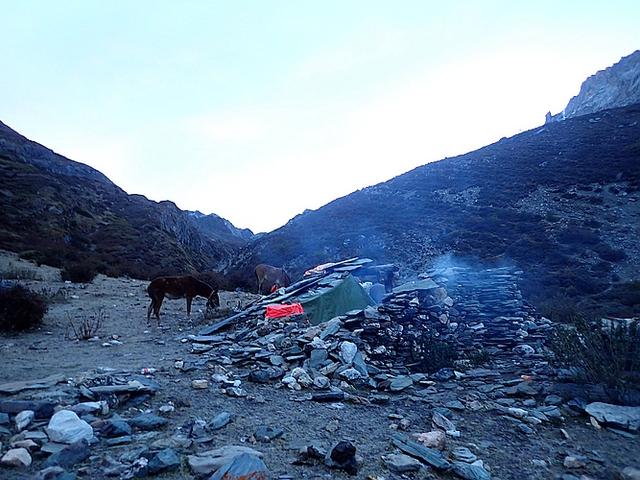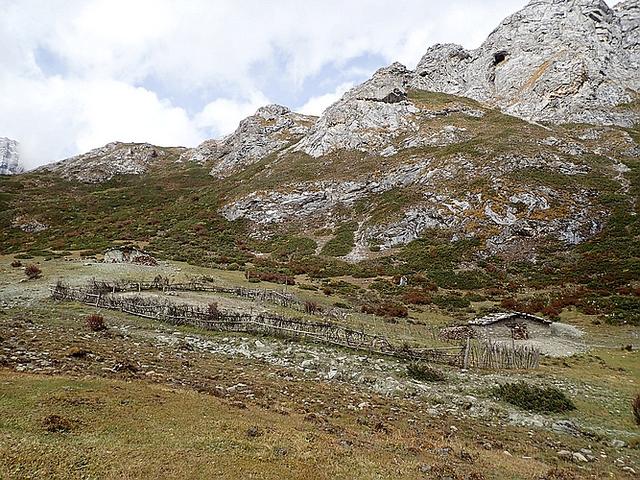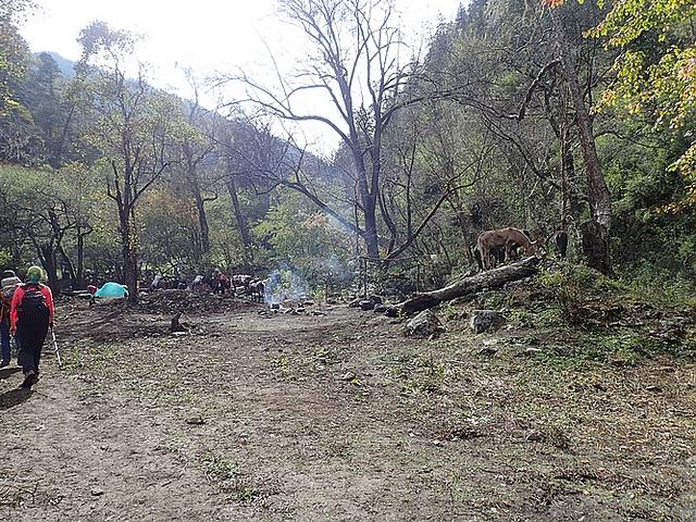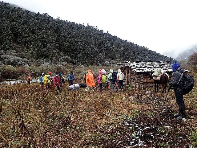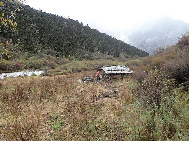 向導帶著我們一路經過好幾個牛場(這區域統稱貢嘎扎則營地),都沒看見馬幫,終于到最后一個牛棚,因為再往前走就要再走兩個多小時才能到下一個牛場曹瓦其牛場。向導決定先讓我們在這沒屋頂的牛場先休息,他回頭走河邊的路再看看馬幫有沒有扎錯地方。