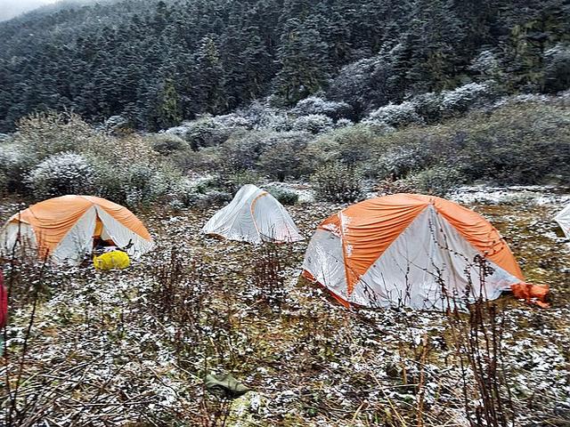 大家又冷又餓,還有一堆人肚子不舒服,只能趕緊生火取暖(外面下著大雪),然后把身上午餐剩下的一些食物趕緊煮些湯湯面面給大家吃,直到晚上七點,巴布才帶著馬幫出現在木屋。我們總算有帳篷可以扎營,今晚可以睡覺了!