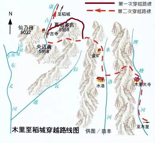 洛克穿越,嚴格來說只有兩次,1928年六月份第一次偏北邊到亞丁,八月份第二次走南邊去亞丁。我們的向導說,我們走的是冷門路線,是洛克第一次的路線(深藍色),靠近北邊,現在大部分的洛克穿越商業團的路線都是走洛克第二次的路線,也就是南邊的路線。不過實際上是我們先走紅色路線從水洛金礦出發,到下滿措牛場之后才往北越過隘口切往曹瓦旗,并沒有從水洛金礦直接切甲落到曹瓦旗。