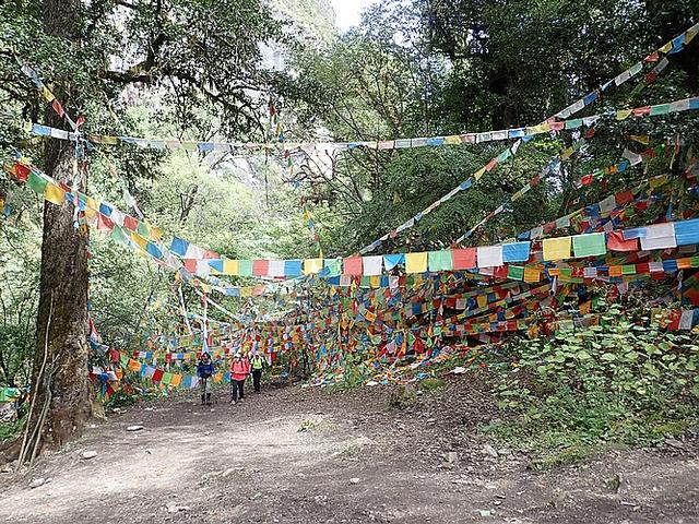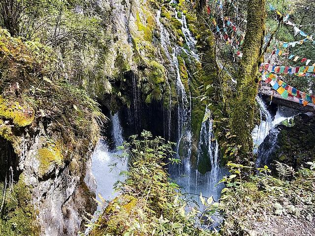 繼續走,來到瀑布區,充滿藏族五色旗的地方,又被稱為菩薩洞