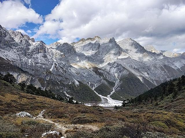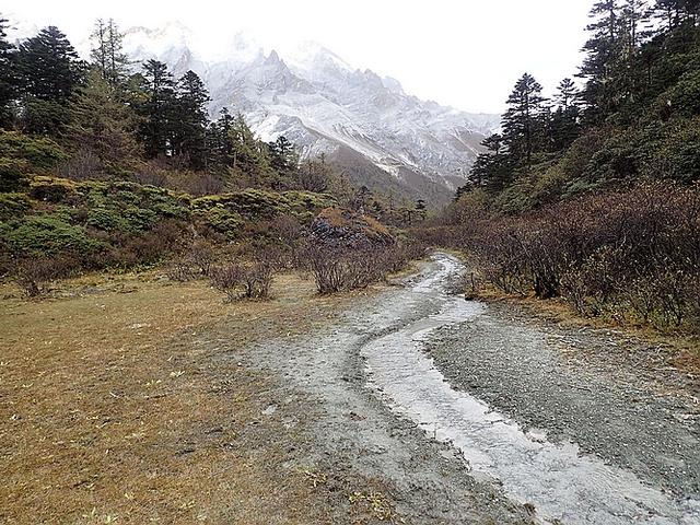 回到營地,我們趕緊打包行李,讓馬幫先上路幫我們把行李運至亞丁。我們則先在營地吃個午餐,12:30才準備自己走下山,天空終于稍微放晴,央邁勇雪山山頂還冒著煙。