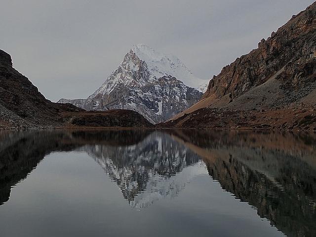 行走幾天后,一座雪山突然就映入眼簾。夜幕降臨我們的高山營地,我坐在帳篷前,面對著稱為夏朗多吉的偉大山峰。這時,云散開了,那是一座平頂金字塔狀的山峰,像一對碩大無比的蝙蝠翅膀。山體披冰帶雪,冰川直達山腳,在那里形成巨大的、宛如園形劇場的冰磧堆積。