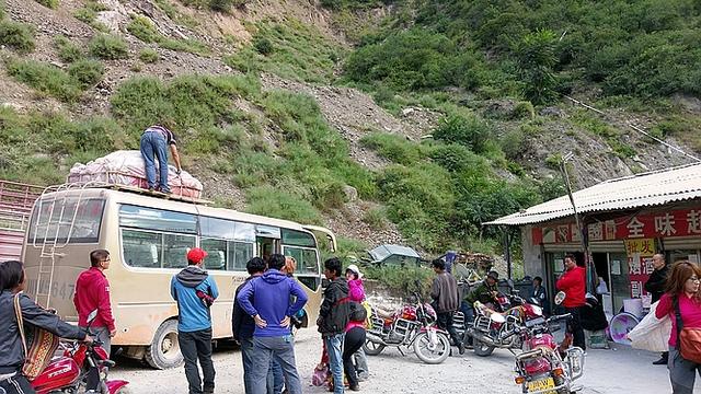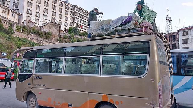從木里到水洛的巴士,一樣又收了我們的背包一個20元人民幣。我們還幫司機把行李都扛上了車頂,再用布包好捆好,因為接下來一路可是會風塵仆仆。