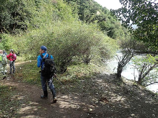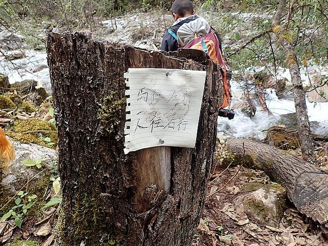 我們在過河之后,往右走去,而非往左方的山坳前進,原因是路竟是之字形爬上山腰,但這條路徑沒有指示標,沒有向導帶路容易走錯。洛克線在這幾年變有名之后,驢友不請向導自行走這條路,2017年一個年輕的山東女醫生就是在這叉路口走錯路受傷骨折,九天后才被搜救尋獲,已經回天乏術。