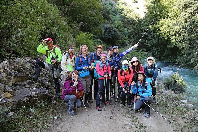 這張大合照角度的遠方河流的流域是明天我們要去逛的景點亞丁,走到一半還遇見我們的馬幫,因為他們已經把我們的行李放在終點,現在他們要循著原路走回洛水鄉嘟魯村。