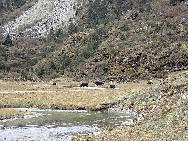 突然又見到白水河,這邊已經是很上游,所以水量變小很多,這個河邊又稱作白水河營地,也可稱下滿措牛場(離滿措牛場還有一段路),我們在這河邊午餐許久,殊不知今天下午的事情會把我搞得人仰馬翻,我們邊午餐邊看著馬幫載著我們的行李爬上了前方的山路,附近有好幾頭悠閑的牦牛,這些都是藏人的資產,他們到了冬天會帶這些牦牛往山下遷移。