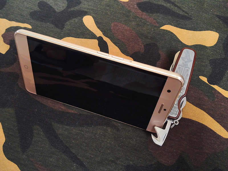勾刀,江湖人稱快遞開子,主要功能是開快遞,不過在我看來,這個勾刀設計用來割繩子也是得心應手。勾刀下部是漢道首創的手機支架,你沒看錯,是手機支架,比起我的買手機套送的支架,檔次高了不是一星半點。