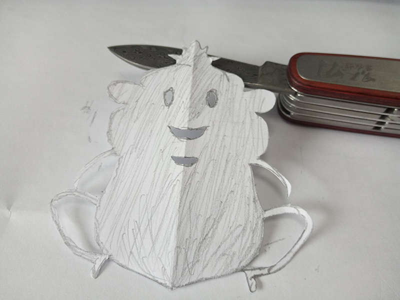 然后對折,在對折過后的紙上用鉛筆描出需要裁剪的圖案,并用剪刀沿圖案裁剪,鏤空位置用刀進行雕刻。