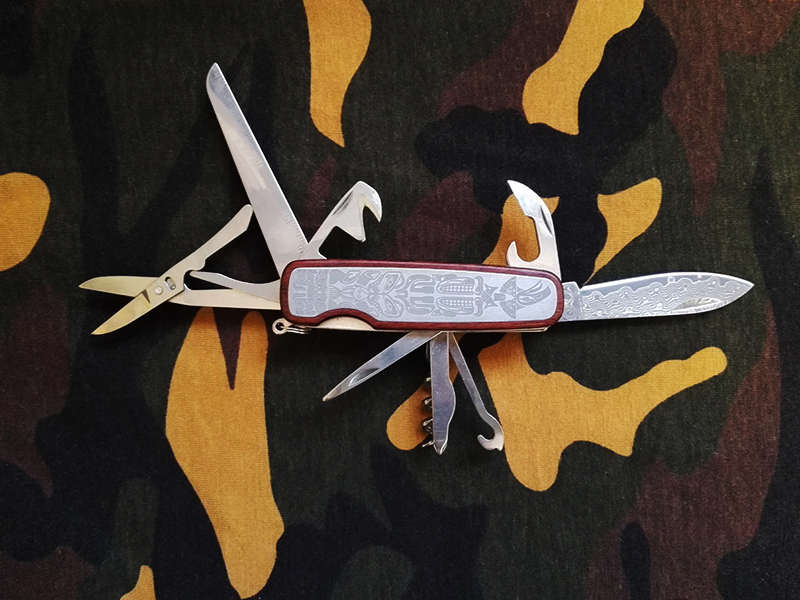 刀,古代是俠客的象征。隨著社會進步,刀具的功能分類越來越被細化,家庭用的菜刀,屠夫用的剁骨刀,士兵用的軍刀,樵夫用的砍刀等,而有一款刀,受到人們的喜愛是因為其多功能,多功能刀具最大名鼎鼎的代表就是瑞士軍刀。國產刀具中也有這么一款集多種功能于一身產品,就是筆者本次介紹的漢道大馬士革軍刀。