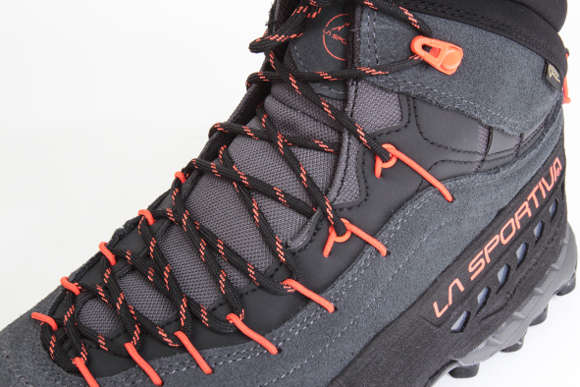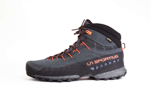 La Sportiva TX4 接近鞋的外觀,基本上是依循健行鞋設計,鞋面是采用大面積的麂皮,搭配亮橘色的印刷字樣、鞋眼扣和鞋帶固定帶。從鞋楦延伸至腳后跟有 1.5mm 的PU TechLite 貼片,增加對腳趾部位和腳跟的防護性,鞋套口部位則藉由增加厚度,提升鞋子對于腳踝的固定性。整體而言,La Sportiva TX4接近鞋的穿著舒適性以及對腳踝的保護性與健行鞋相當接近。