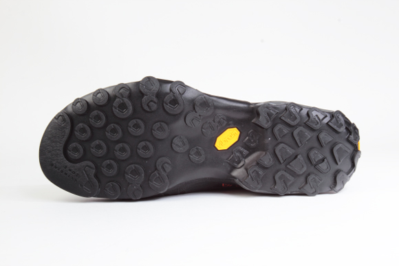 La Sportiva TX4 接近鞋為了讓鞋底能夠具備巖鞋的摩擦力,鞋齒設計成圓盤狀,讓鞋齒與巖面接觸時能夠像章魚吸盤般抓牢巖面,更重要的關鍵在于鞋大底採用Vibram Mega-Grip 黏性橡膠底,這幾乎是Vibram 鞋底中最具備抗滑能力的款式。此外,鞋尖處還有一塊Climbing Zone,讓穿著者可以更靈活地利用腳尖踩踏巖點,行走在崎嶇的巖塊上或是攀爬巖壁更顯得駕輕就熟。