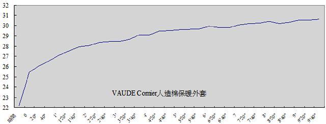 在雪山實測時,這件外套穿起來的保暖效果不遜色于700FP的羽絨外套,下山之后我們拿外套實測,于室溫22℃、相對濕度65%的環境下,穿上外套10分鐘后,外套內測得之溫度可上升至31℃,僅比相同條件下測試700FP的羽絨外套低0.5℃,保暖效果相當卓著!