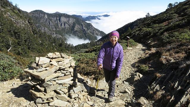 出發日天氣大好,抵達雪山東峰時陽光普照,然而疾風狂吹,云海在腳下翻騰不已。此時上身穿著排汗內衣在加上Power Stretch保暖上衣,最外層穿著VAUDE Cornier保暖外套,雖然拍照的手指被風吹到刺痛發麻,但身上是暖的,防風效果非常好,彈性束口的袖口能有效防止冷風灌進來。