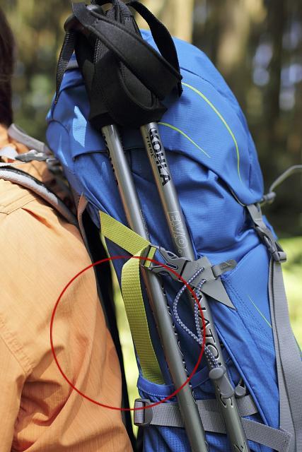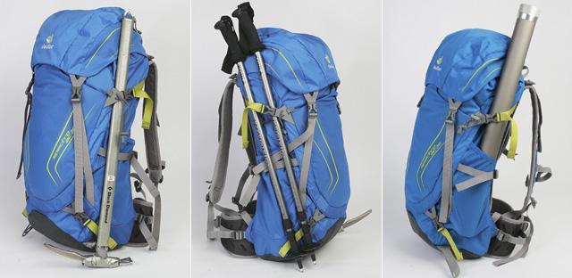 左:冰鎬的攜帶。中:登山杖的收納。相機角架或釣竿筒的收納。