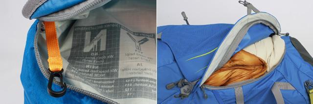 左:背包頂袋的小掛鉤與緊急聯絡資訊書寫處。右:背包背面可以打開,方便取物。