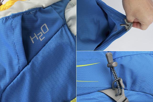 左:水袋吸管穿出口(背包側面) 右上:外側彈性網袋(可放簡便衣物、帽子等) 右下:彈性束繩