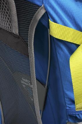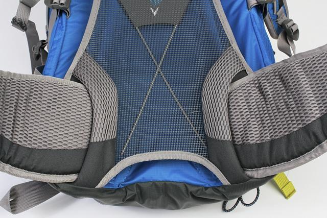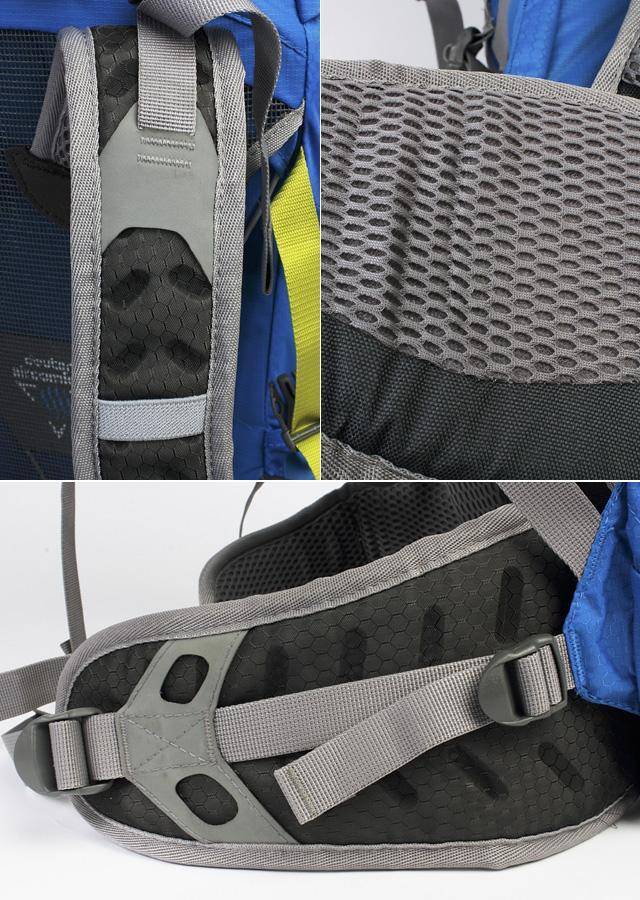 再者就是透氣網架了。這項來自1984年deuter的專利,最大好處就是讓背部背負背包時,與背包內側保持距離、增加通風性,這與傳統背包有很大的不同。再者,強力彈性網架,會反饋背包的重量,讓背部受力均勻,而不會讓某些特定點受到壓迫。