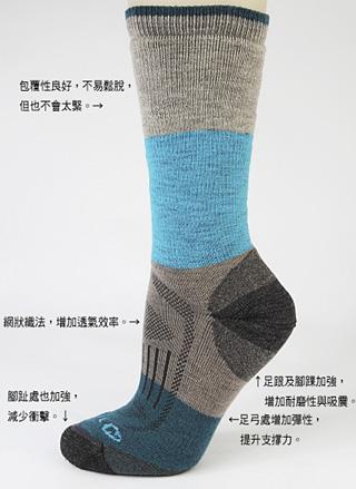 4.抗菌除臭:能夠維持多天穿著而不必清洗對長程的登山活動而言相當重要,因為這樣就能減少行李。為了達到抗菌除臭,現在的襪子多導入銀纖維或混合各種天然礦物質,再依一定比例混合在聚酯纖維中,并使其滅菌除臭功效能在使用與洗濯下至少維持三年。