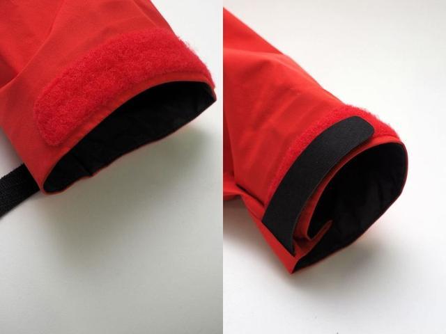 袖部符合人體曲線,內側短、外側長,方便活動,而且配合始祖鳥的特殊剪裁設計,在魔鬼粘黏起后,可以將袖子形成一個排水溝渠,幫助雨水滑落。黏貼的部分跟外套表布選用不同的顏色,除了好找外也有一點畫龍點睛的視覺效果。