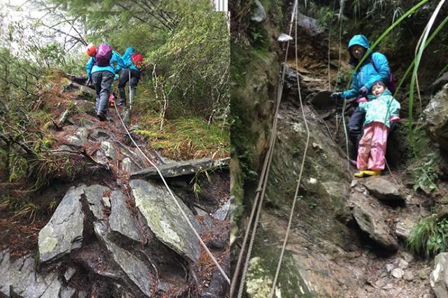 第二天行程,是輕裝登頂,此時這雙鞋完全展現(xiàn)其優(yōu)勢,在未負重的情況下,完全能展現(xiàn)其舒適性及止滑度。這一日風(fēng)雨交加,并未幫鞋子照特寫,但從以下照片可得知地形混雜艱困,從潮濕巨巖陡升陡降、渡溪及拉繩急上,穿著這鞋都能游刃有余。