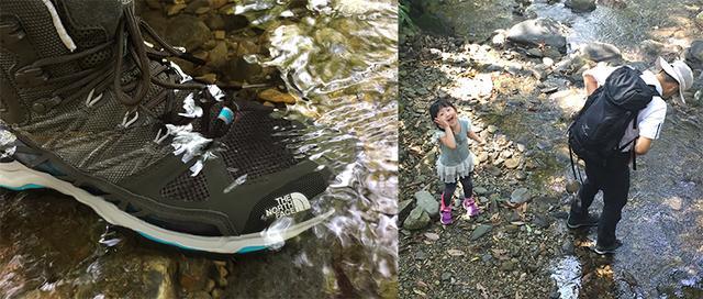 各式路面走起來都很舒適,有足夠的耐震性及包覆性,且GORE-TEX的防水功讓我能放心走在有水洼的路面。離開了植物園,我們特別帶小朋友去玩水,也進一步測試其在溪流中的防水性跟止滑效果。