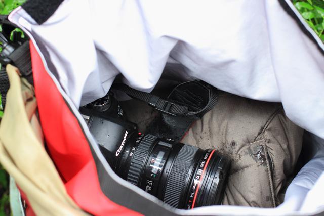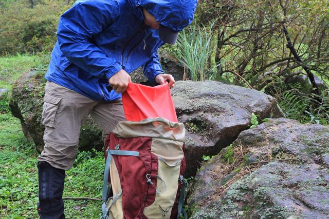 下雨時,可將重要器材放入防水背包中保護。