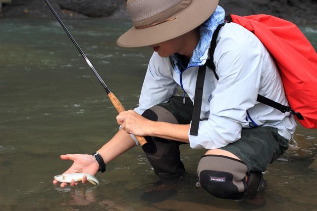 溪釣時,防水背包很實用。