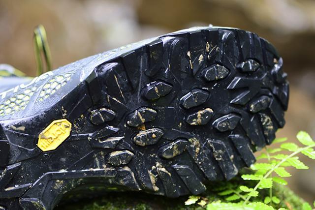 本款鞋采用Impact Brake System技術(shù)與5mm鞋齒的Vibram大底,由楔形鞋齒的排列,提升制動(dòng)力與反饋力道,此外,大底橡膠的邵氏硬度除了鞋跟部位約為72度外,其余部位則是較軟的68度,較Vibram傳統(tǒng)鞋底75至80稍軟(注),這不算太硬也不會(huì)太軟的大底設(shè)定,能夠兼顧一定程度的支撐力與對(duì)地面磨擦力,加上稍深鞋齒提升對(duì)泥地抓地力的配置,更能有效應(yīng)付中、低海拔地面容易濕滑與泥濘的情形,當(dāng)然遇上大石塊上的薄泥與細(xì)青苔還是請(qǐng)留意腳步。